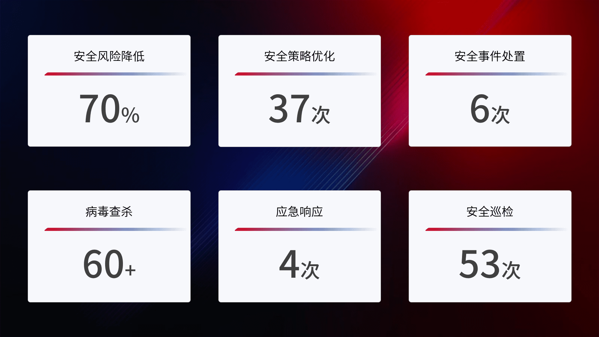 提供全面的安全事件报告体系,,,,包括处置报告、、、周报、、季度和年度总结,,结合持续监控,,,帮助客户深入了解网络安全状况。。。。